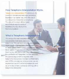 Over-the-phone interpretation (OPI) is similar to a 3-way conference call with the interpreter translating between the other 2 parties who speak a different language on the phone. We provide interpretation for 230+ languages allowing you to overcome any language barrier and create understanding. You can sign up for an on-demand account and have access to an interpreter today!
